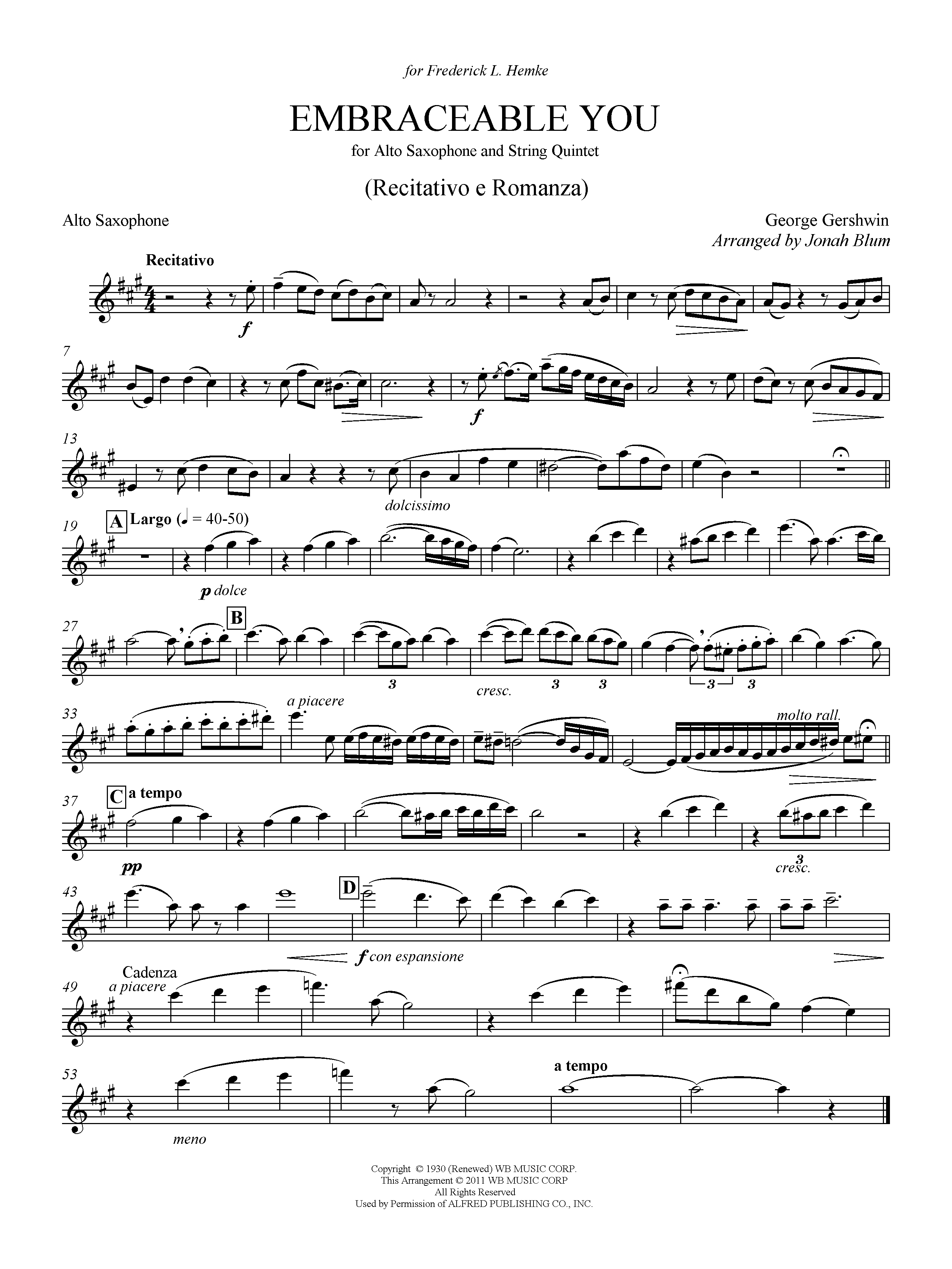 These musical arrangements by Jonah Blum are available for alto saxophone and string quintet (string quartet plus bass), or in reductions for alto saxophone and piano.